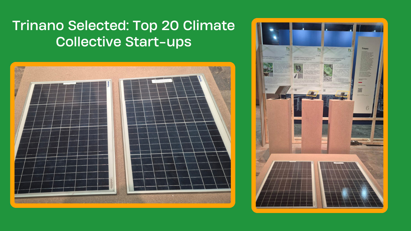 TriNano Technologies is thrilled to announce our selection as one of the top 20 startups chosen by “Climate Collective” to present our innovative product/technology at the “Conscious Collective” event for sustainability. This prestigious event, themed “Reclaiming Cool,” focuses on heat-resilient design, equitable futures, and climate-responsive living, and will be held from December 12th to 14th, 2025, at the renowned Godrej Design Lab in Vikhroli, Mumbai. We invite you to join us and discover how our nature-inspired technology enhances the efficiency and productivity of solar panels while minimizing water usage for cleaning. Let’s collaborate towards a cleaner, greener energy future and a better world for all.